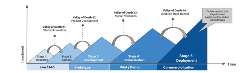 Figure 1: Climate Tech’s Valleys of Death. In moving through the Demonstration to Deployment stage, new challenges emerge in manufacturing, hiring and workforce capital management. Source: Rocky Mountain Institute; Greentech Media